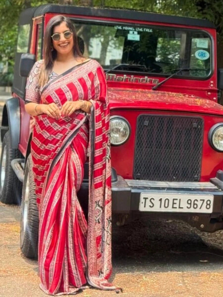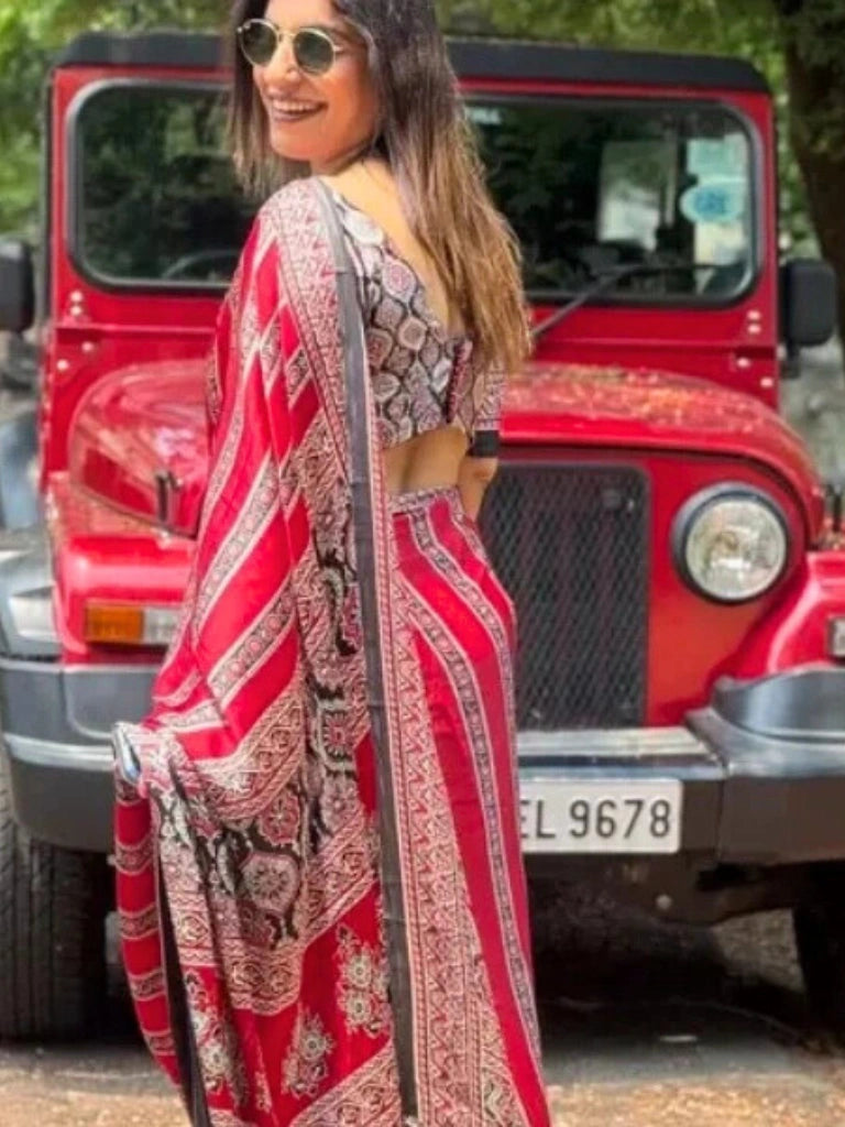 Description: Beautiful bollywood inspired saree. Drape yourself in pure sophistication with this saree, where every fold radiates a soft, luminous glow. Its fluid fabric effortlessly embraces your form, creating a regal and enchanting presence ideal for weddings, receptions, and celebratory evenings.